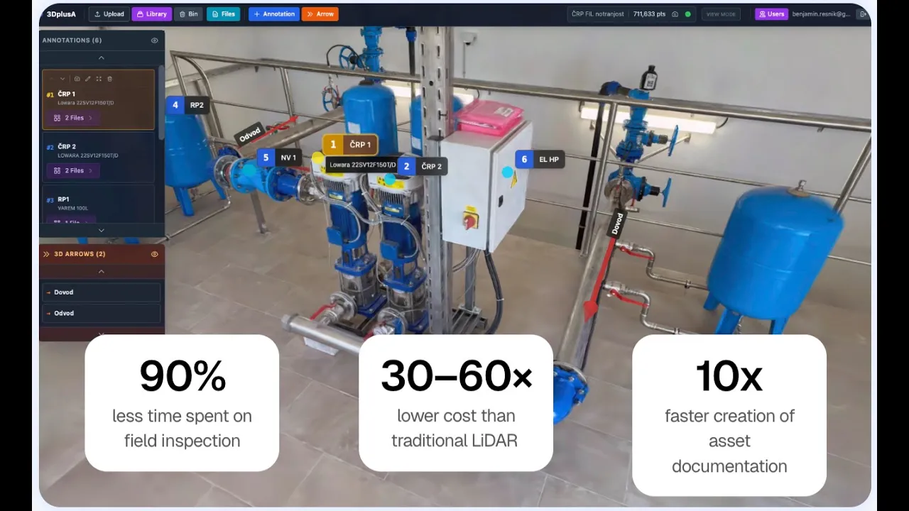 3DplusA turns simple video captures into photorealistic 3D environments. Inside each model, users can search assets, open documentation, inspect sensor data, annotate, and collaborate—all in the browser.
